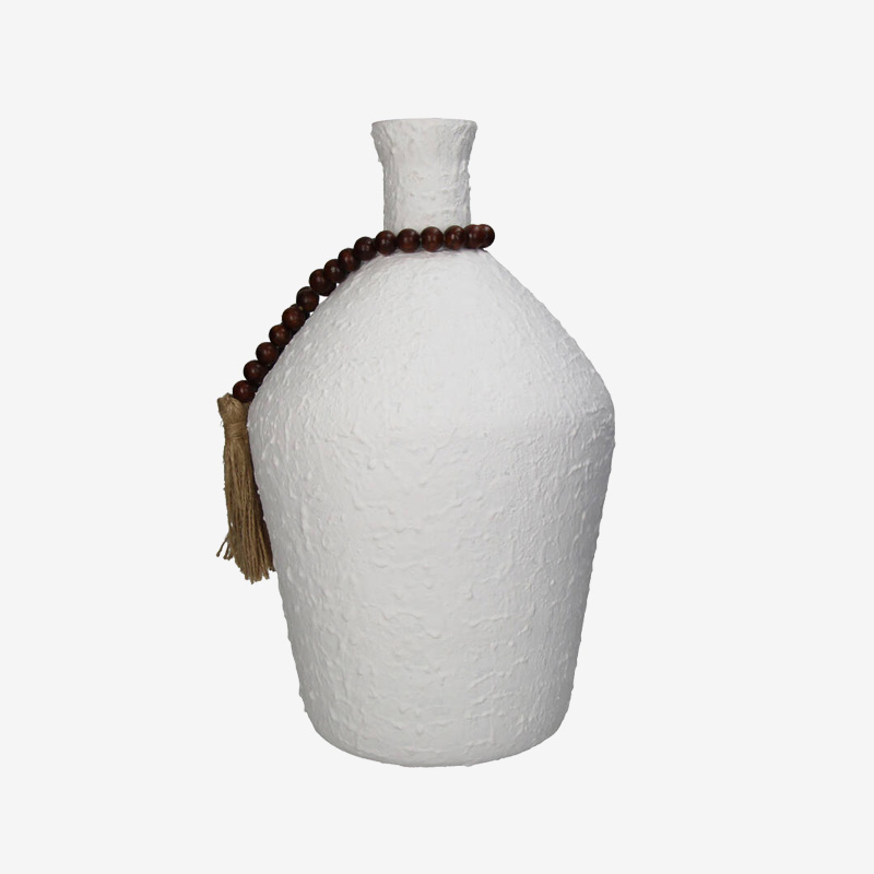 Deze vaas is gemaakt van helder glas met aan de buitenkant een dikke mat witte coating. Het is een frisse verschijning met een speelse bruine kralenketting om de hals.