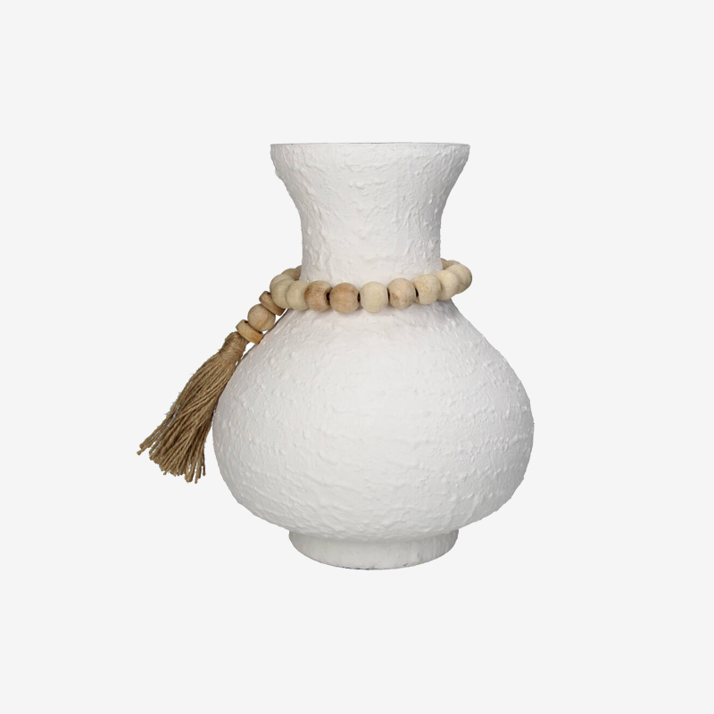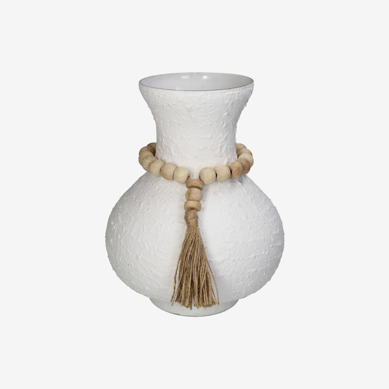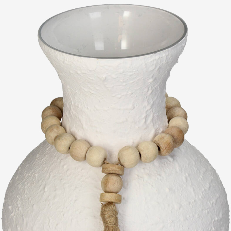 Deze vaas is gemaakt van helder glas met aan de buitenkant een dikke mat witte coating. Het is een frisse verschijning met een speelse naturel kralenketting om de hals.