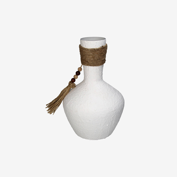 Deze vaas is gemaakt van helder glas met aan de buitenkant een dikke mat witte coating. Het is een frisse verschijning met een speels detail om de hals.