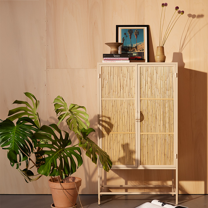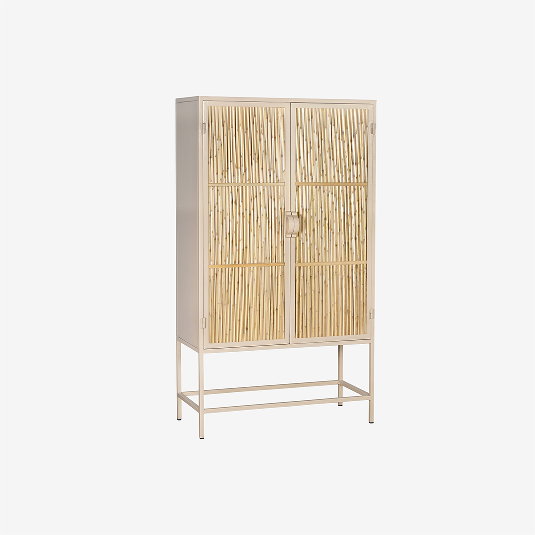 Breng industrieel karakter en natuurlijke warmte samen in jouw interieur met de Tucson wandkast van New Routz, uitgevoerd in een zachte zandkleur. Deze kast combineert een stevig metalen frame met subtiel bewerkte bamboe-inleg. Een opvallende blikvanger die elegantie en robuustheid naadloos verenigt.