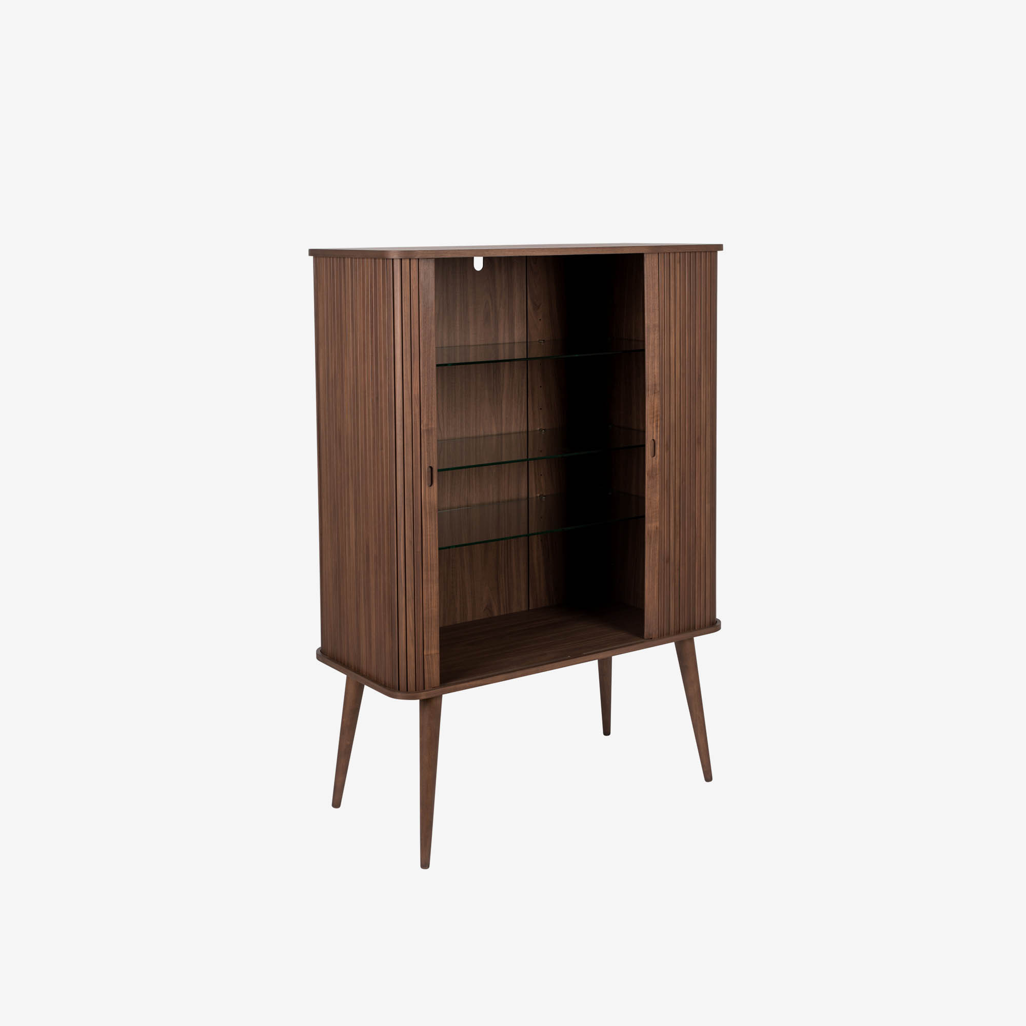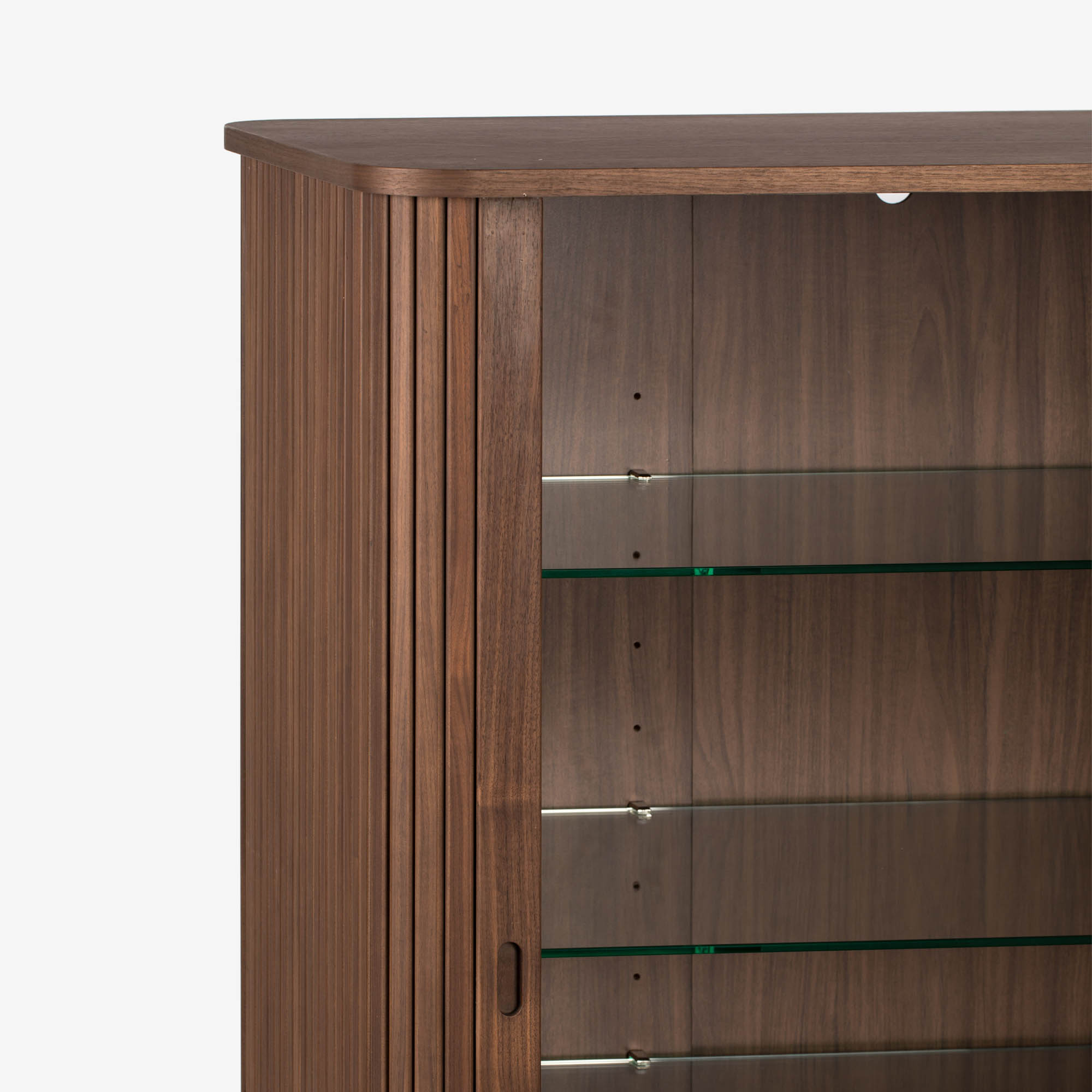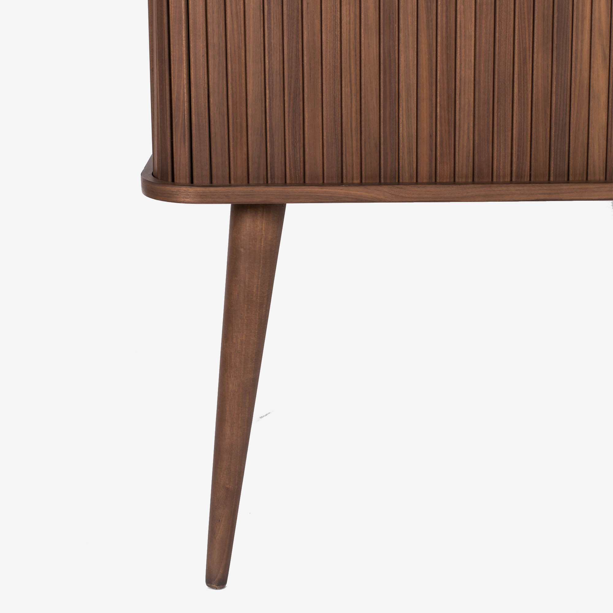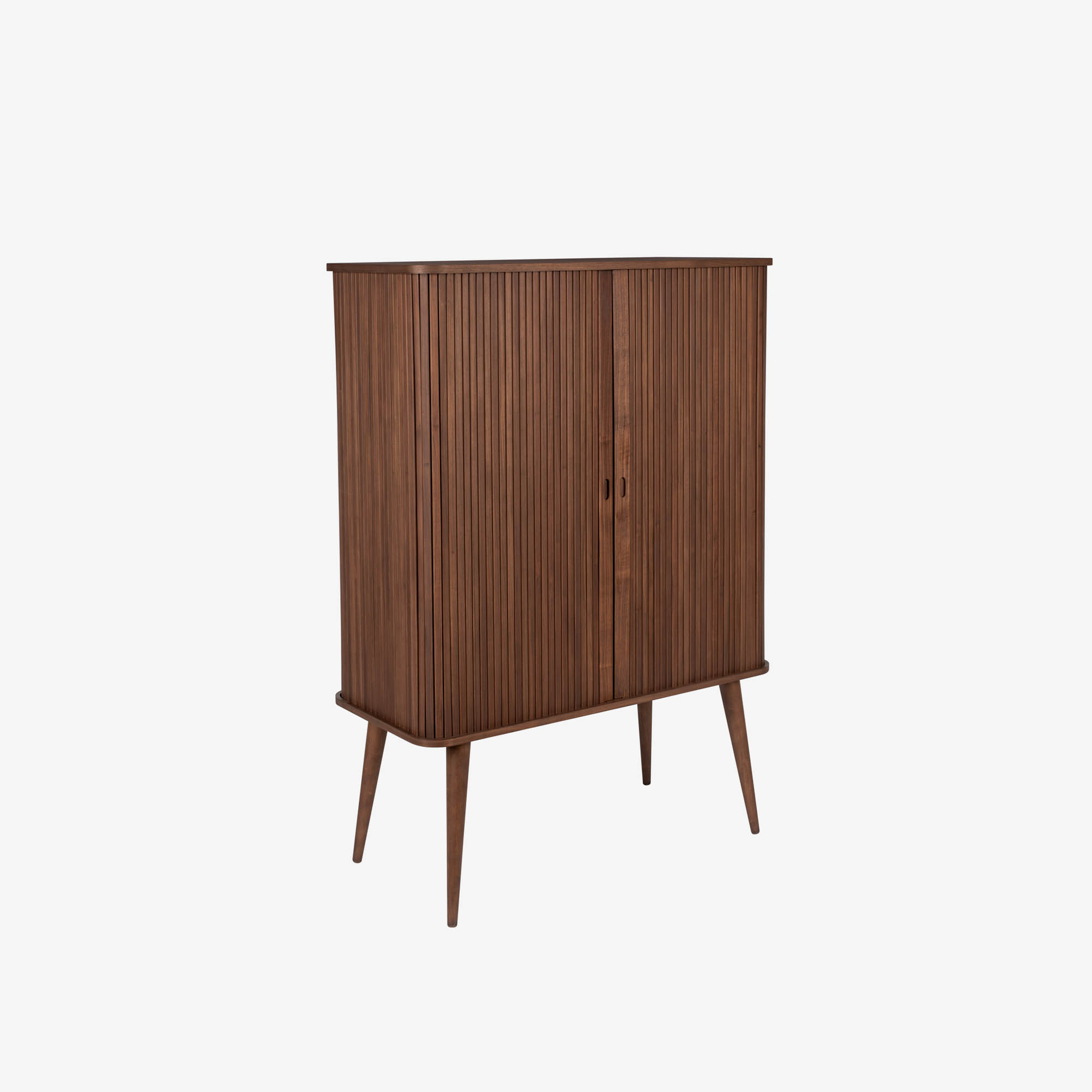 Houten kast met bijzonder jaloeziedeursysteem die werken als een soort theaterdeuren zodat je de kast zowel geopend als gesloten kunt gebruiken.