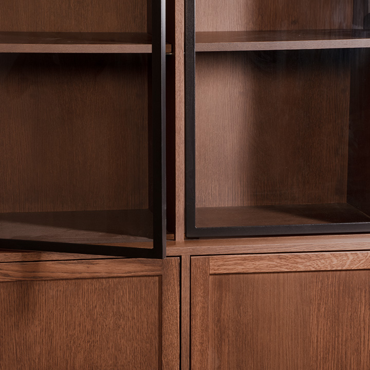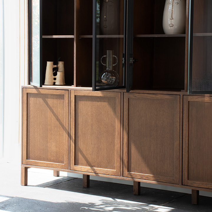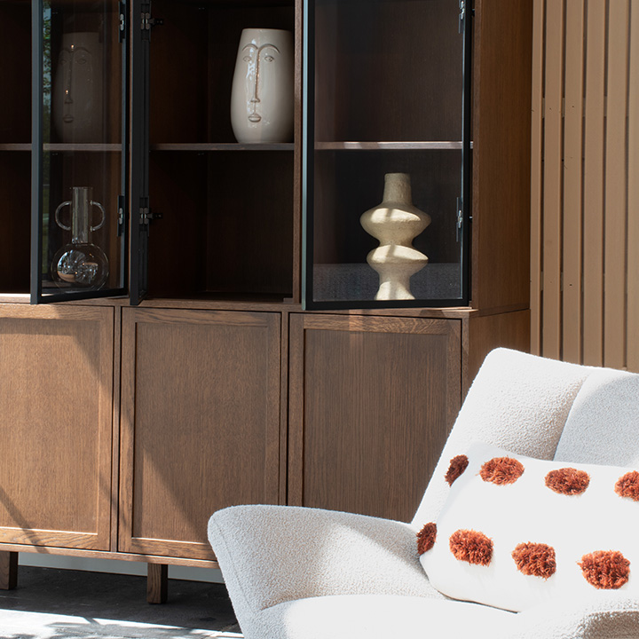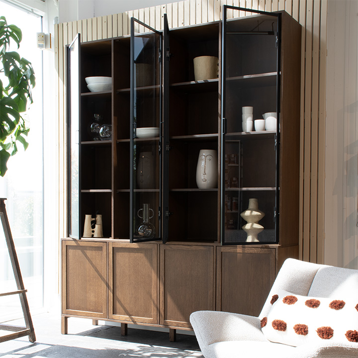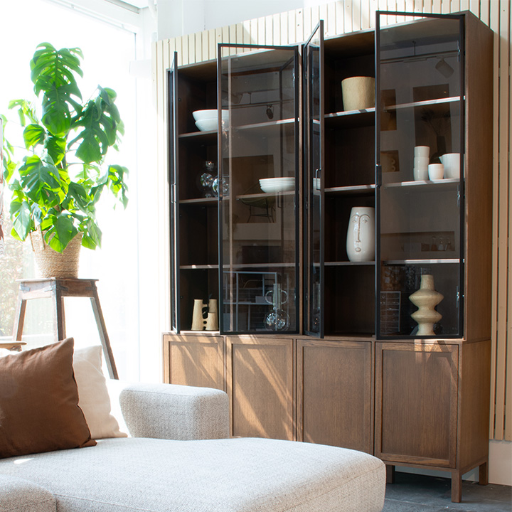 De vitrinekast Jordan heeft een statige uitstraling. Deze grote vitrinekast past in een modern interieur, maar misstaat zeker niet in een industrieel of landelijk interieur. Jordan heeft een subtiel oosters tintje door het pure design en een perfecte detaillering. De Jordan kent vele uitvoeringen qua kleur en afmeting, zodat je de kast naar wens kunt samenstellen.