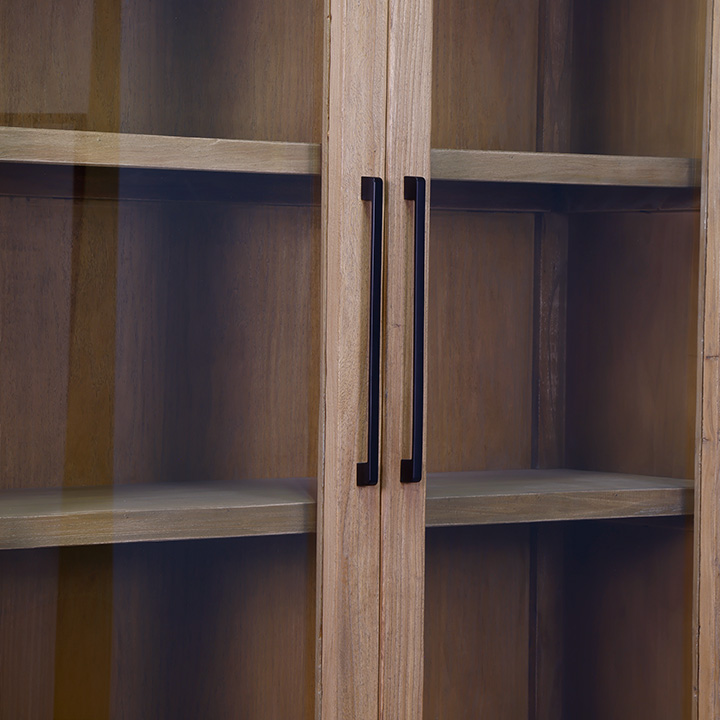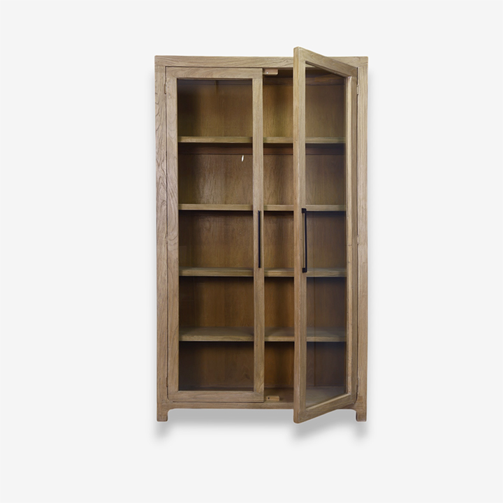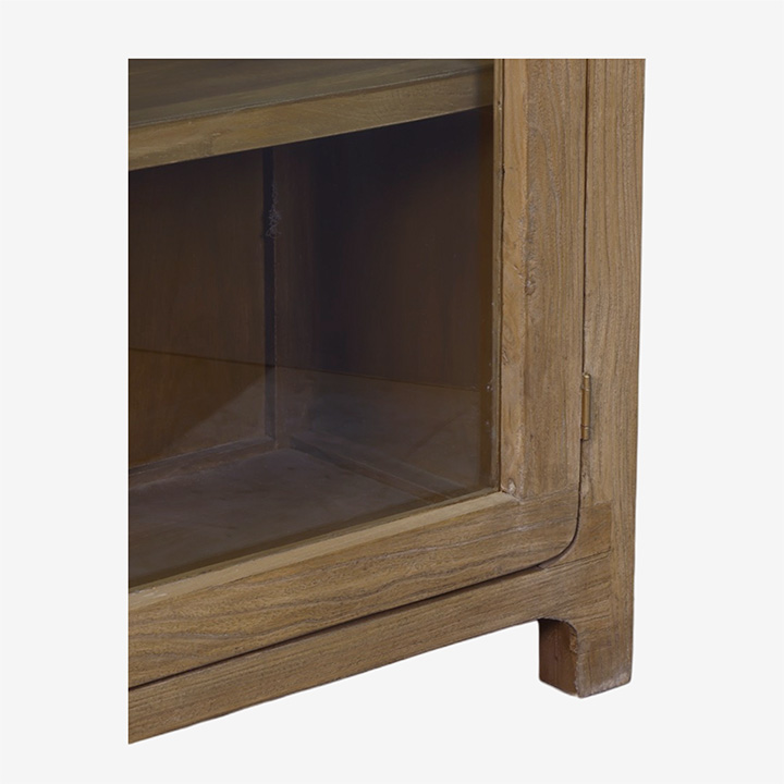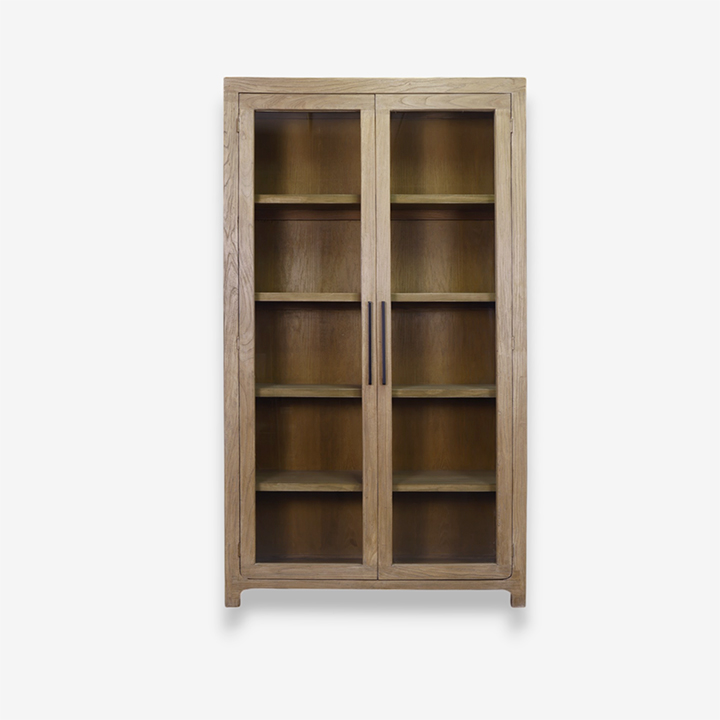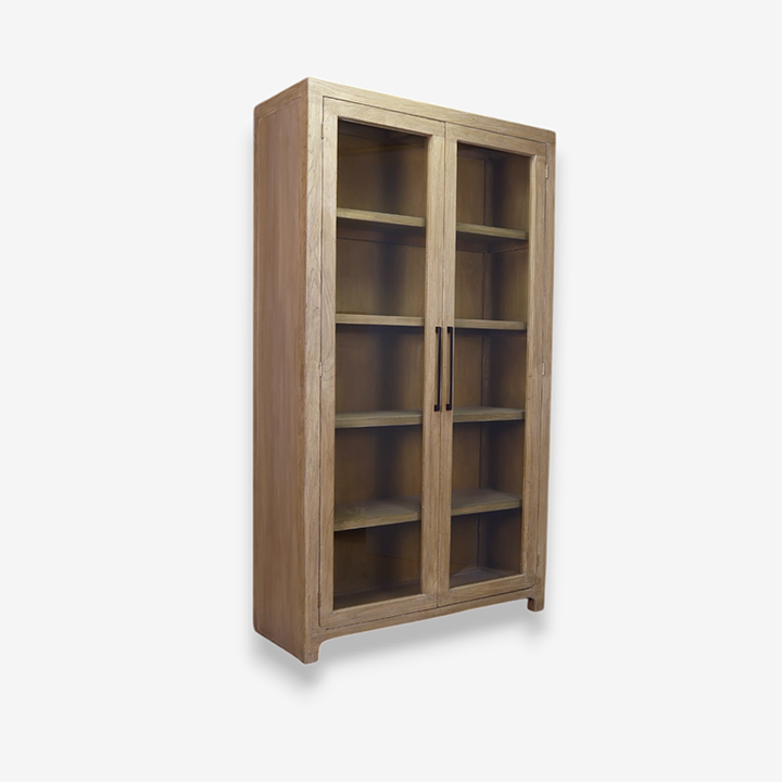 Deze ruime 2-deurs vitrinekast van oud Elmwood biedt een robuuste uitstraling in combinatie met een relatief strakke belijning. Stal je mooiste souvenirs of servies in deze beauty uit.