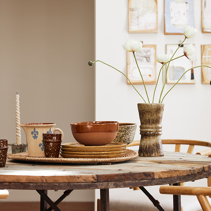 Oude ronde markttafel met grof houten blad op metalen onderstel.
