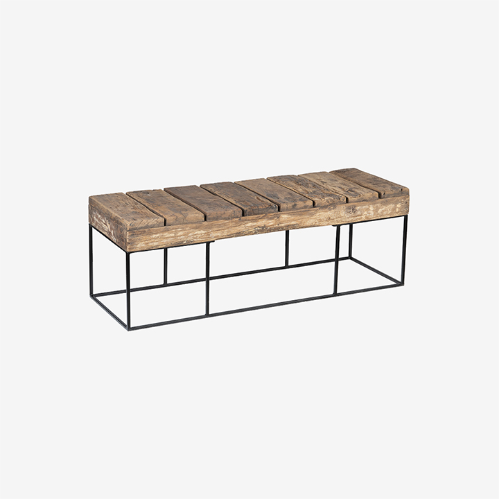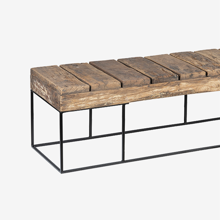 Deze salontafel is gemaakt van oud hout en staat op een slank metalen onderstel.