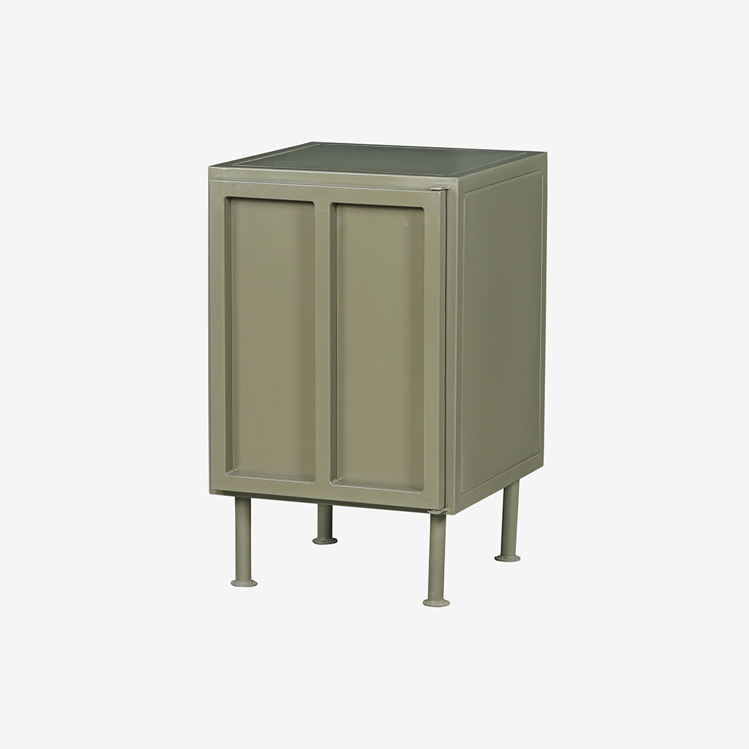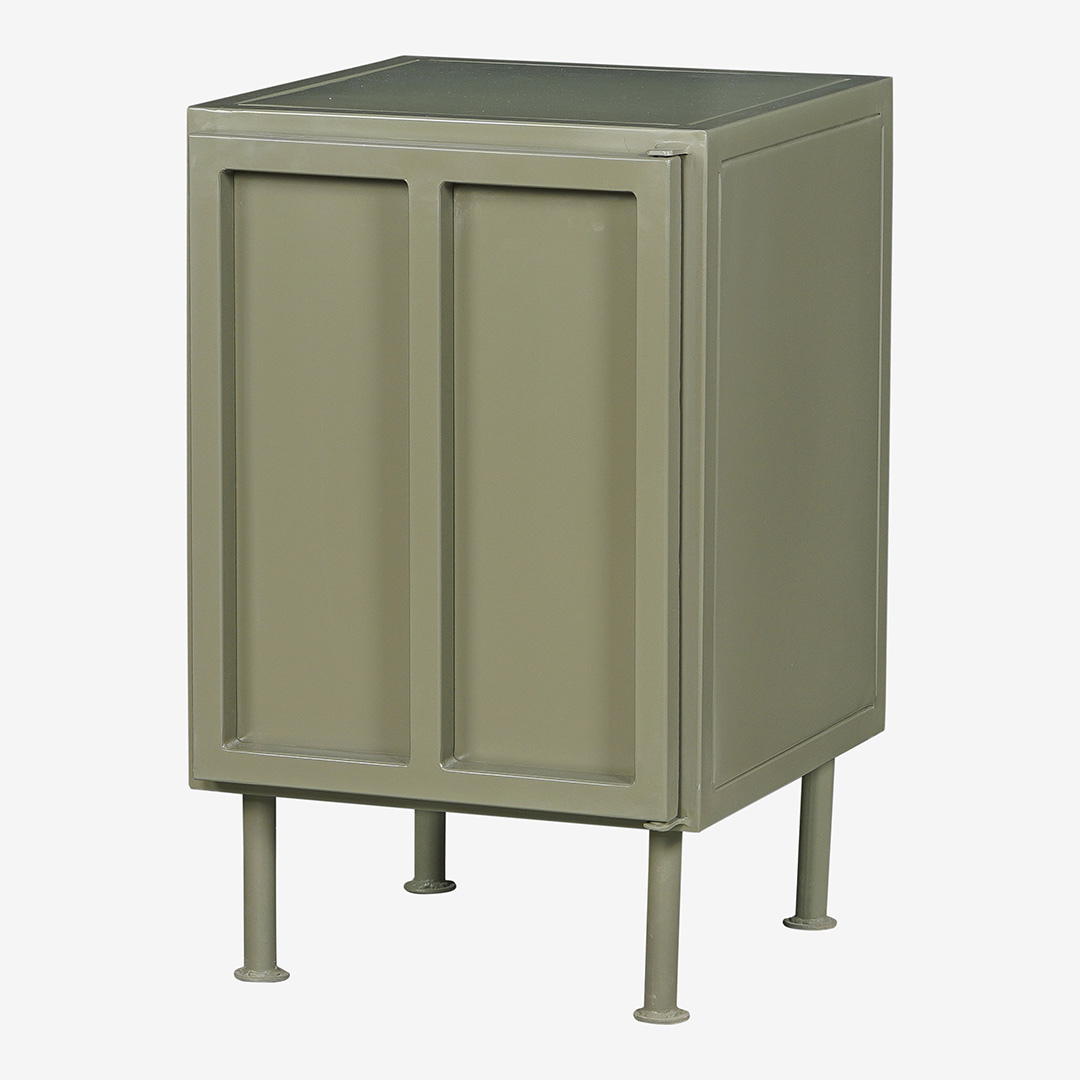 Compact 1-deurs kastje uit de collectie van New Routz gemaakt van metaal afgewerkt in de kleur zand of olijf groen.
