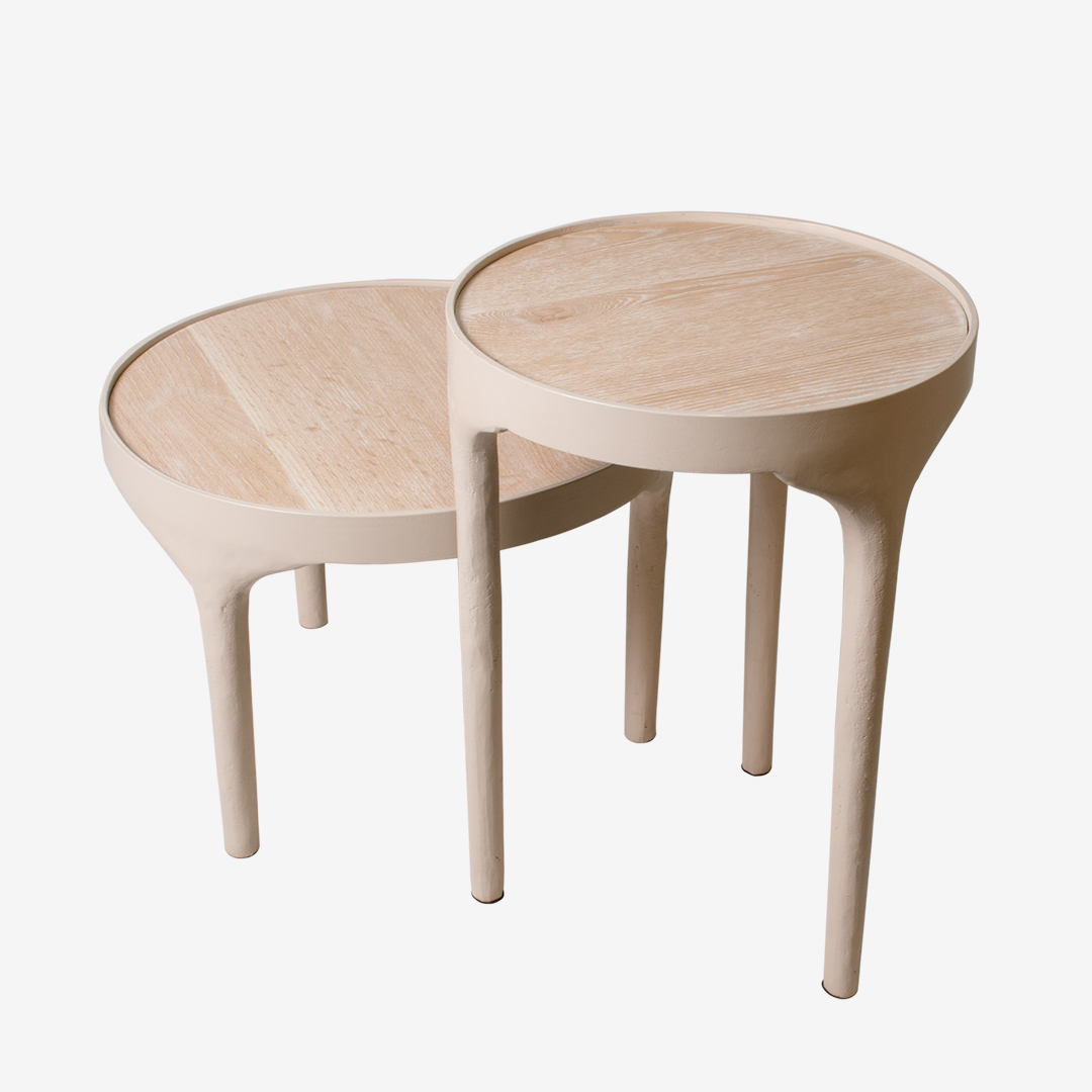 Stoer, rond salontafeltje van metaal in de kleur zand en eiken blad.