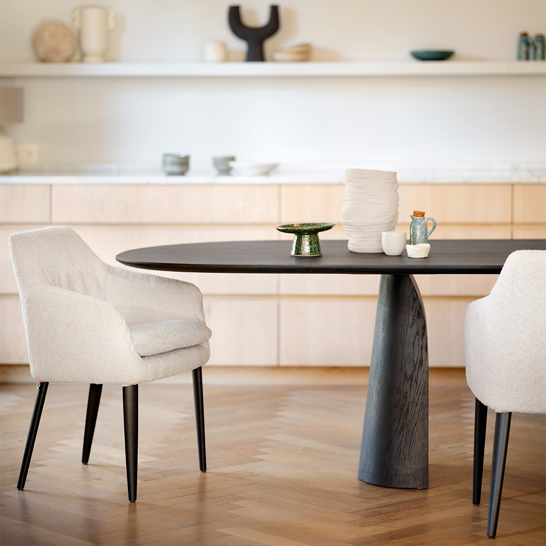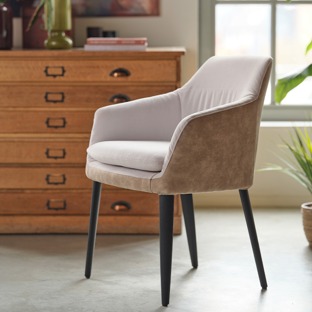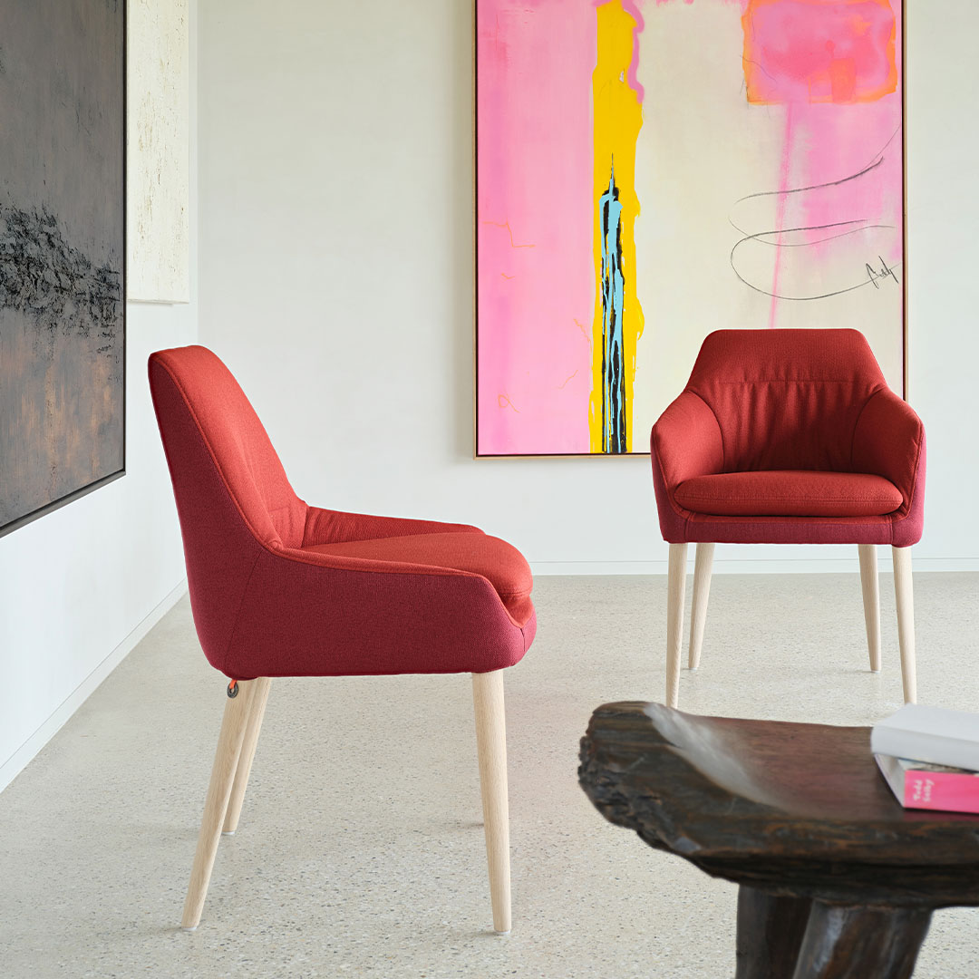 Een stoel met royale en rustgevende rondingen verkrijgbaar in vele kleuren en dessins.