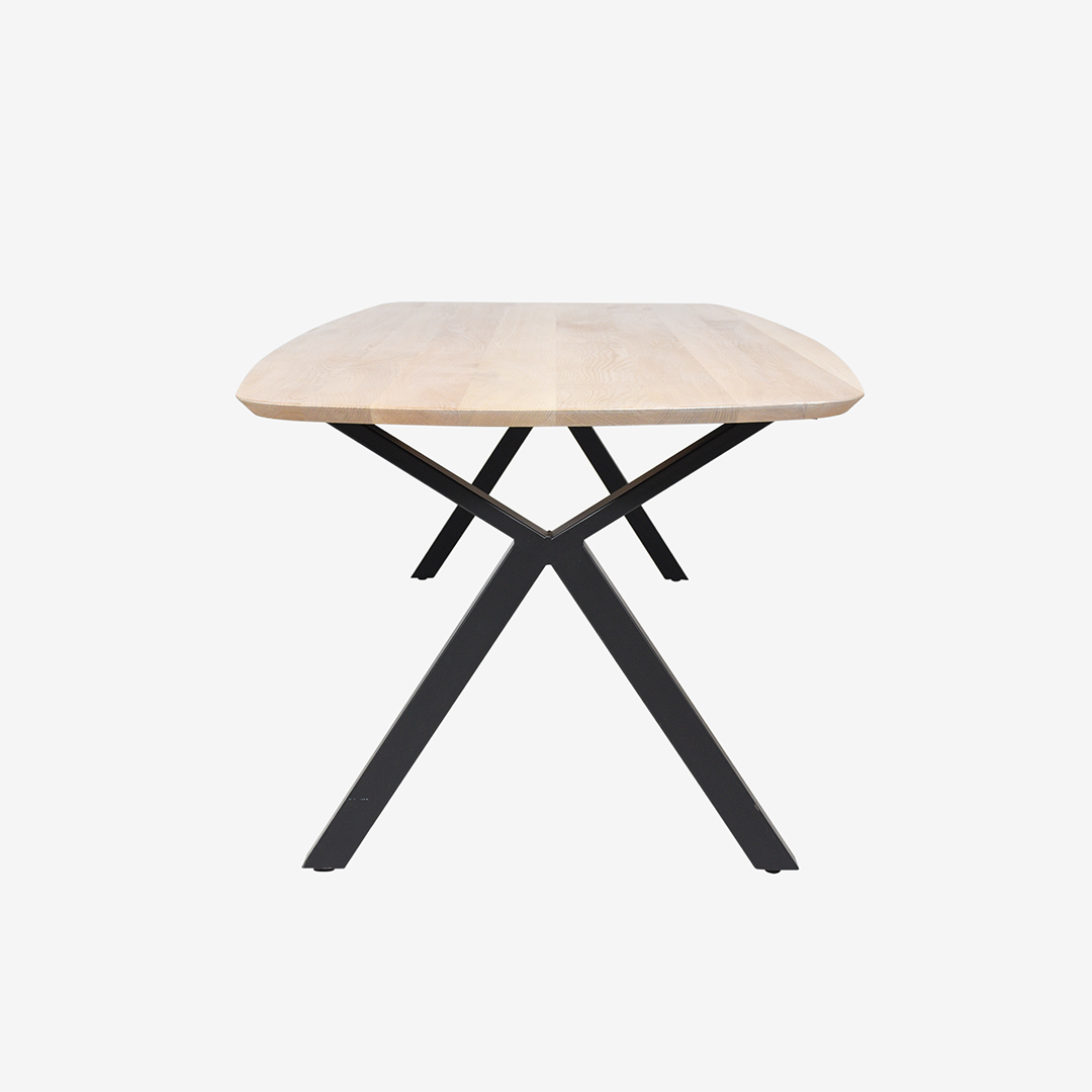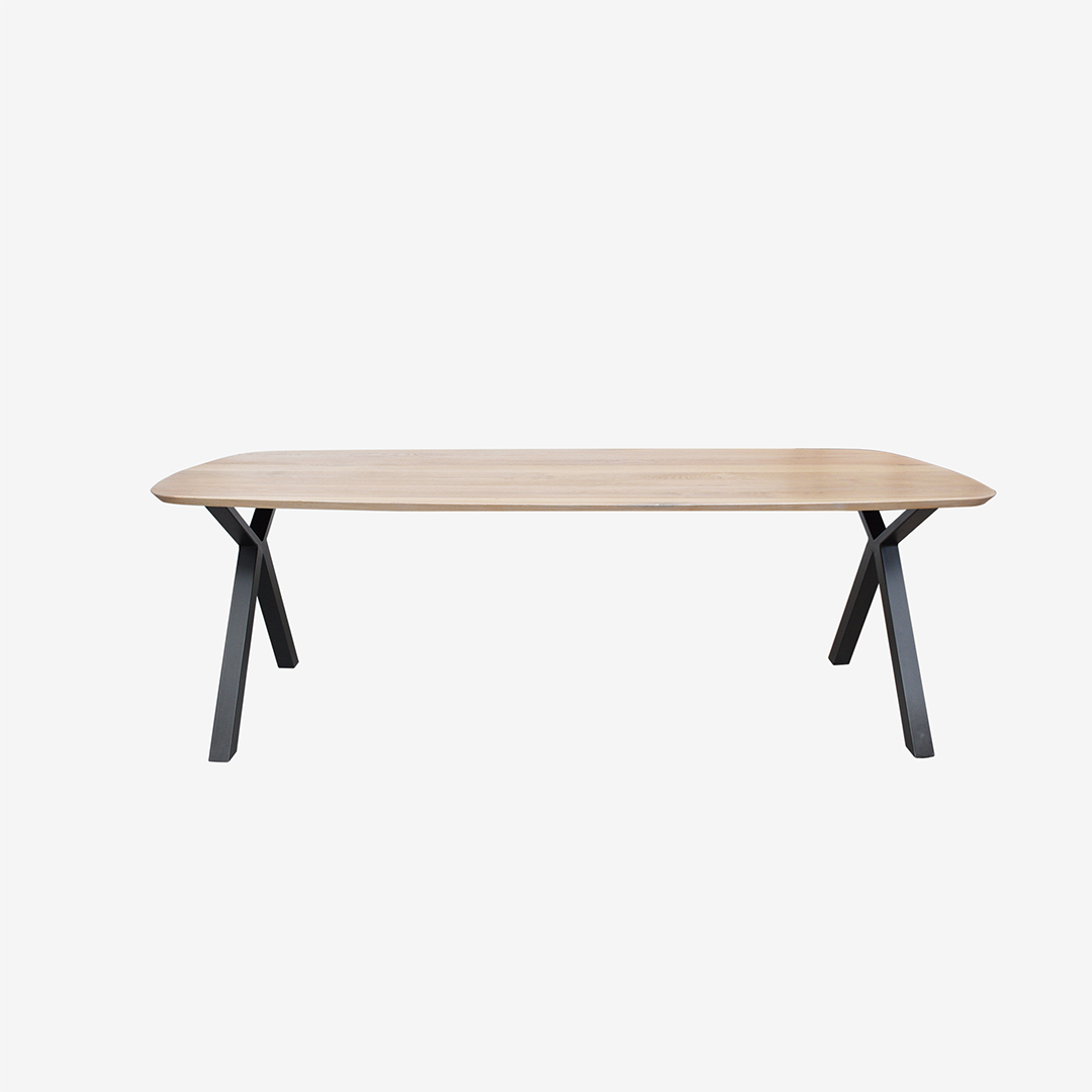 Tafel van massief eikenhout op eigen Kabinet ontworpen metalen onderstel. Verkrijgbaar in een groot aantal afmetingen en diverse kleuren. Stel ook jouw eettafel samen en ontwerp je eigen, unieke designtafel.