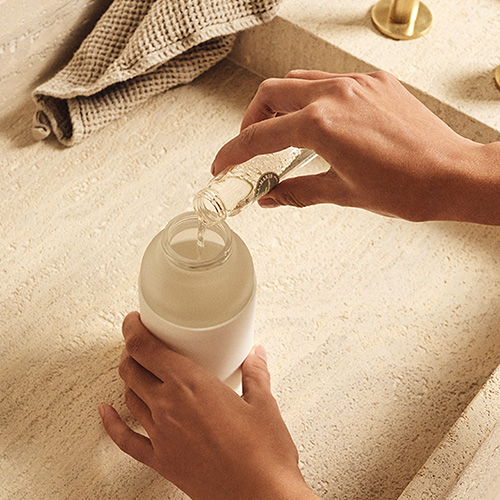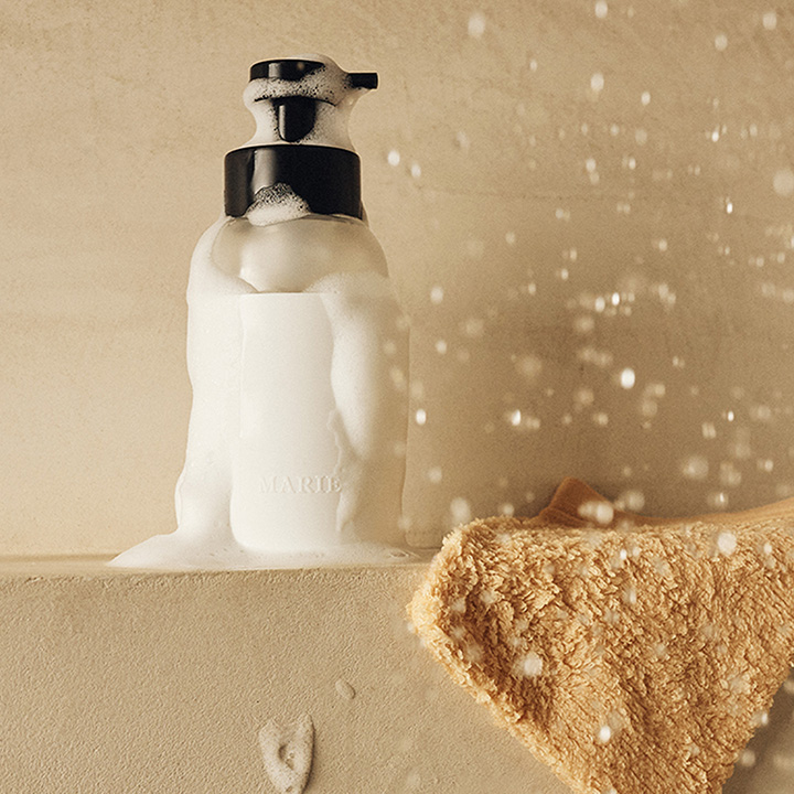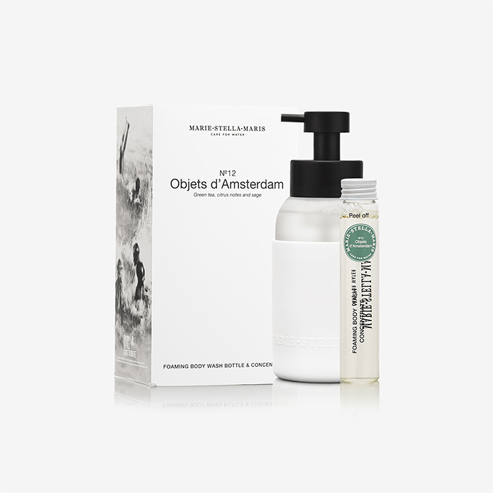 De Foaming Body Wash fles die eindeloos navulbaar is met kraanwater en de Marie-Stella-Maris Body Wash Concentrates. In de geur No. 12 Objets d Amsterdam.