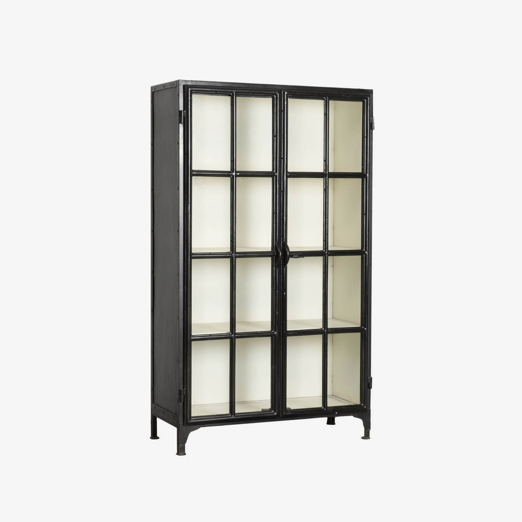 De metalen meidenkast Glendale uit de collectie van New Routz heeft 2 openslaande deuren met glas. Deze vitrinekast heeft een mooie industrieel-klassieke uitstraling door de bijzondere glasverdeling in de deuren. Geef de meidenkast Glendale een prominente plaats in je interieur en gebruik hem bijvoorbeeld om accessoires, servies of je kookboeken in uit te stallen.