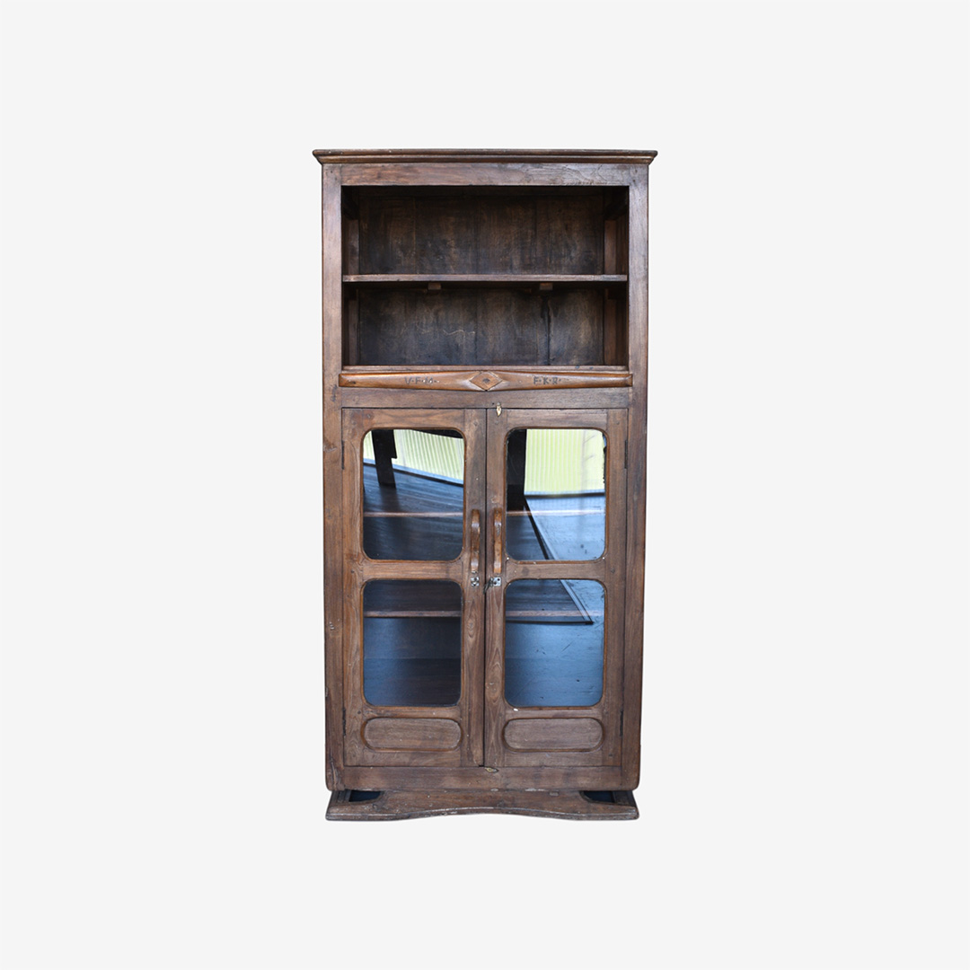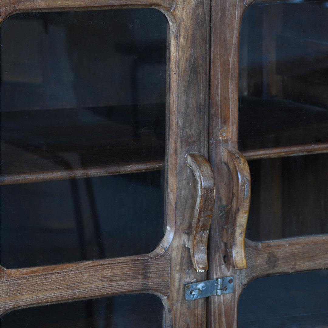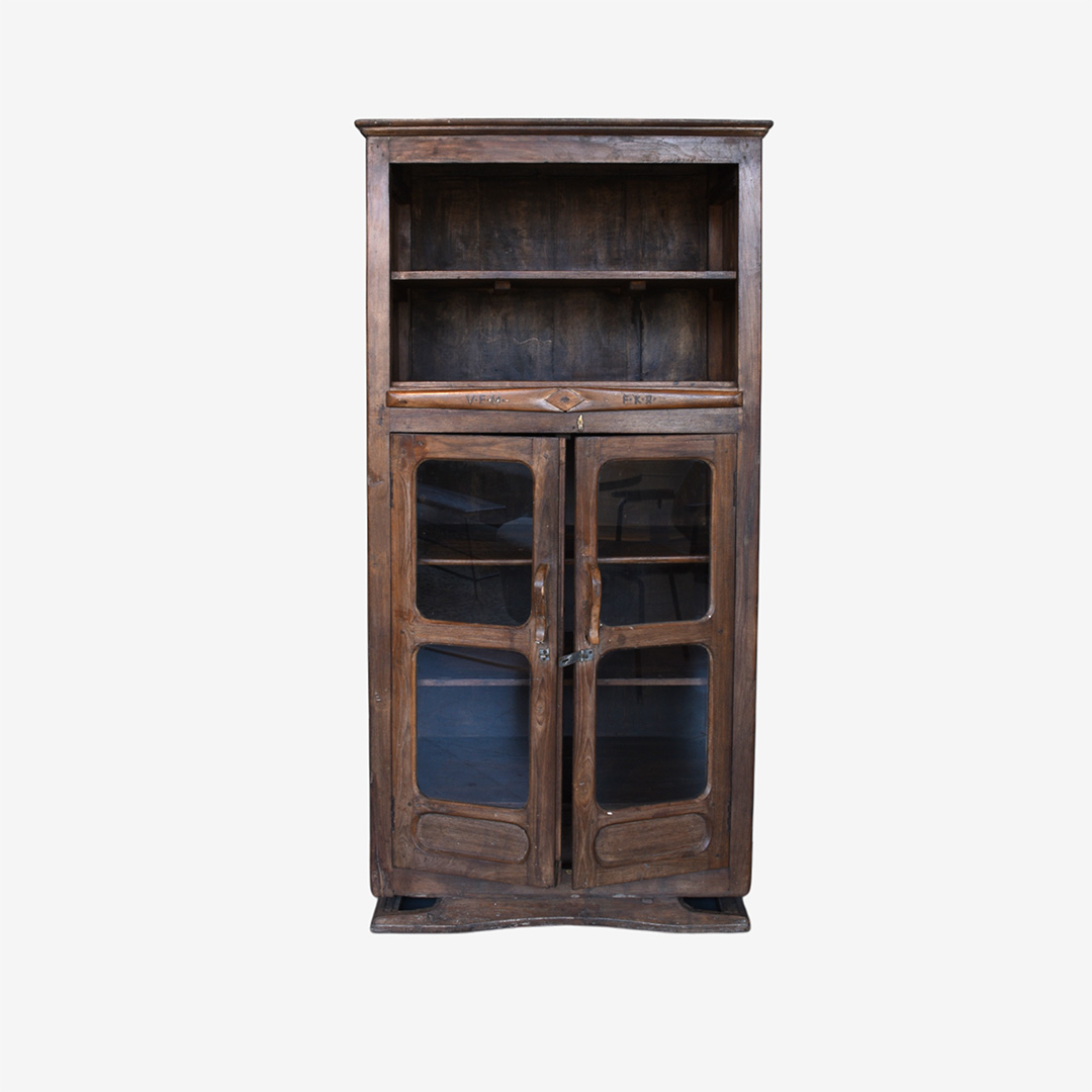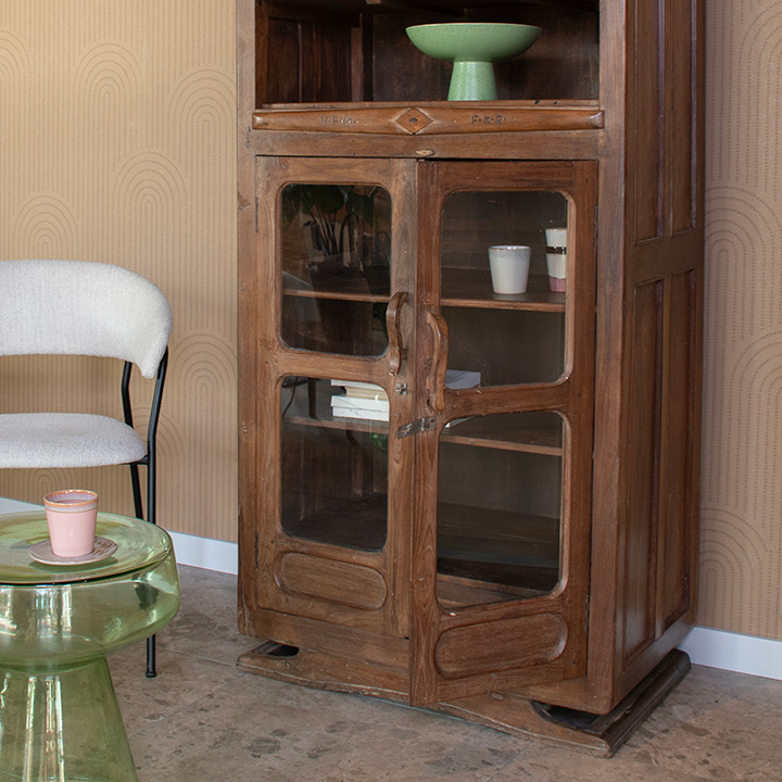De oude kast is extra bijzonder door de 2 open vakken aan de bovenkant en de details zoals het houtsnijwerk en de houten handvatten. De poot geeft de kast een Art Deco look.