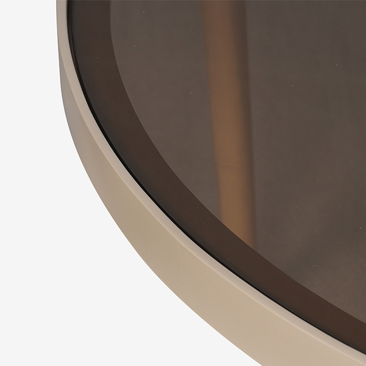 Ronde salontafel met een robuuste en organische uitstraling. Een bijzondere combinatie van industrieel metaal met retro bruin glas.