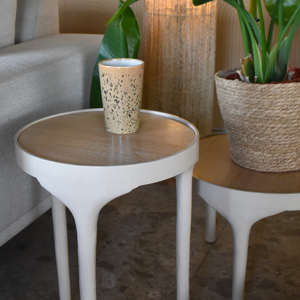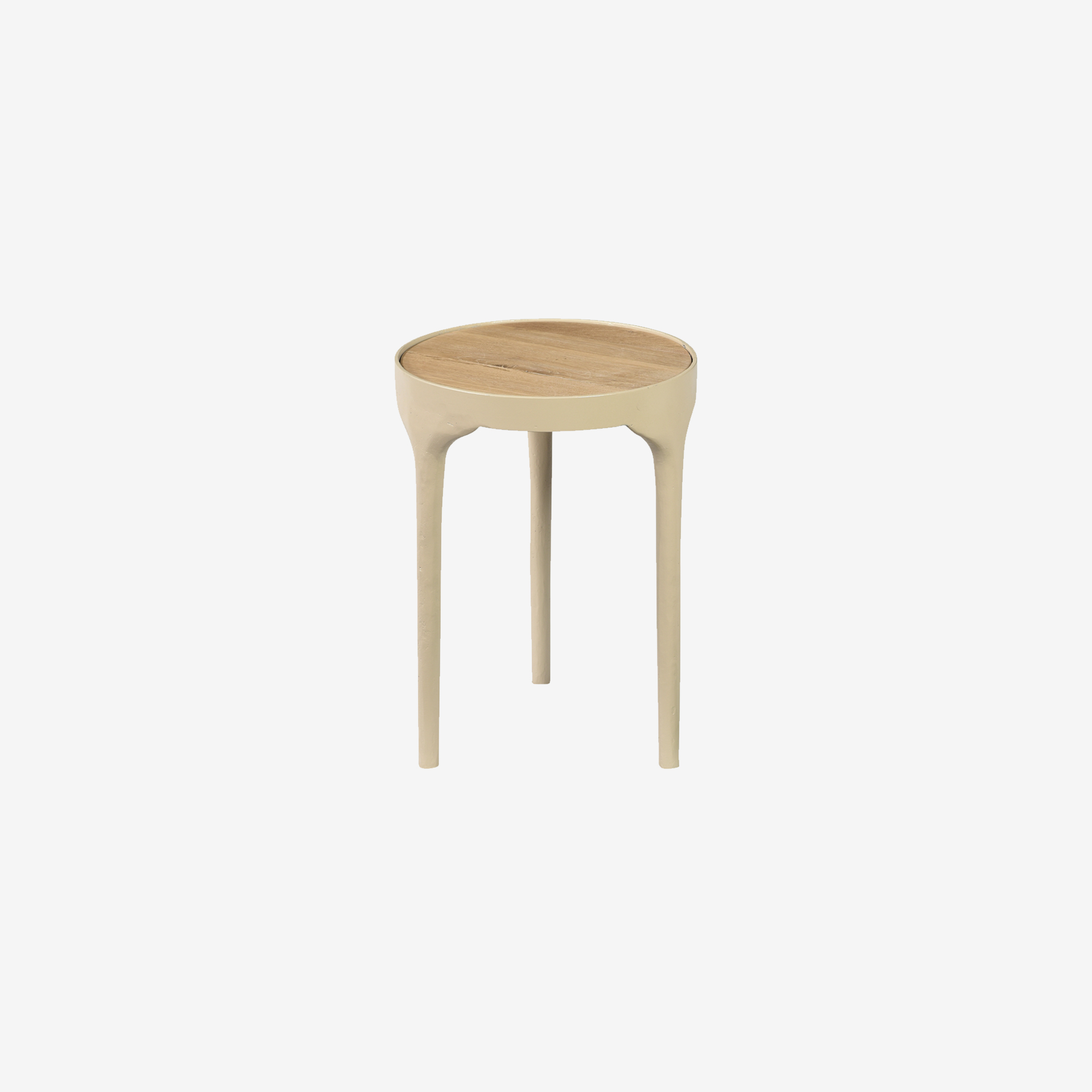 Stoer, rond salontafeltje van metaal in de kleur zand en eiken blad.