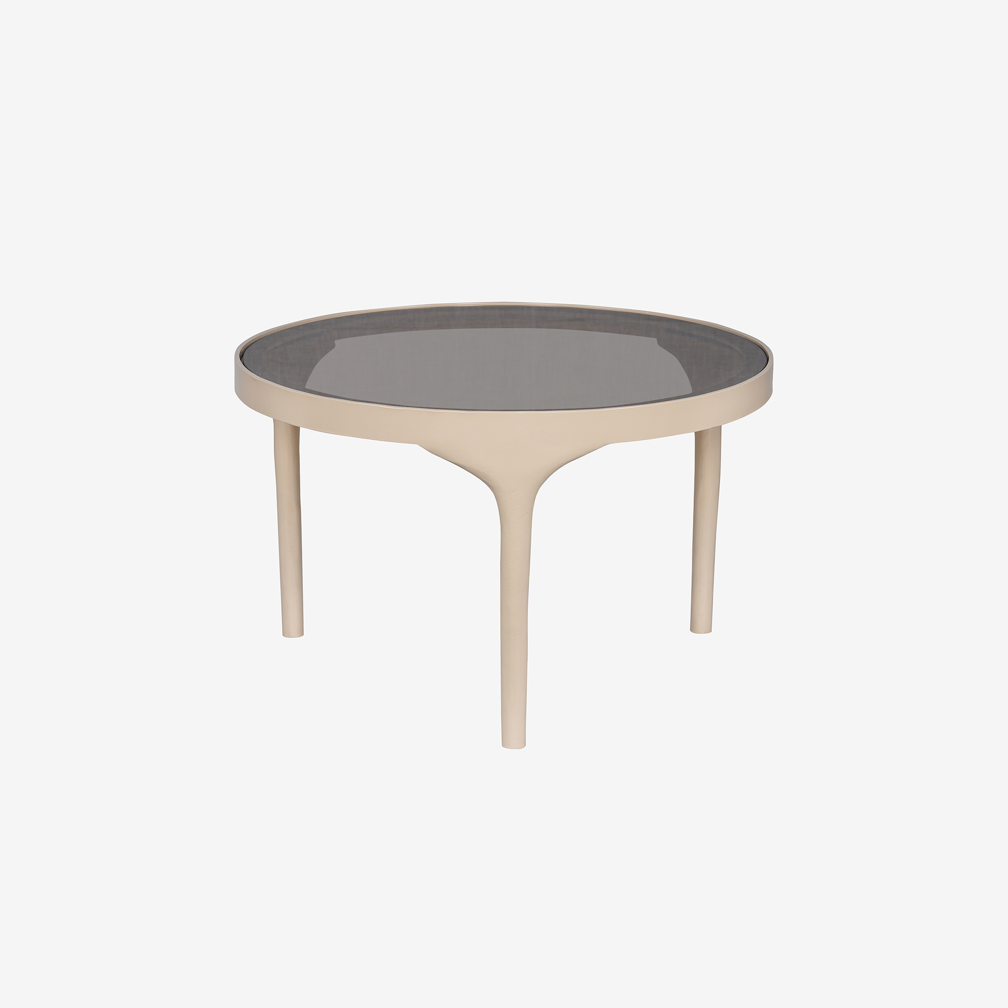 Ronde salontafel met een robuuste en organische uitstraling. Een bijzondere combinatie van industrieel metaal met retro bruin glas.
