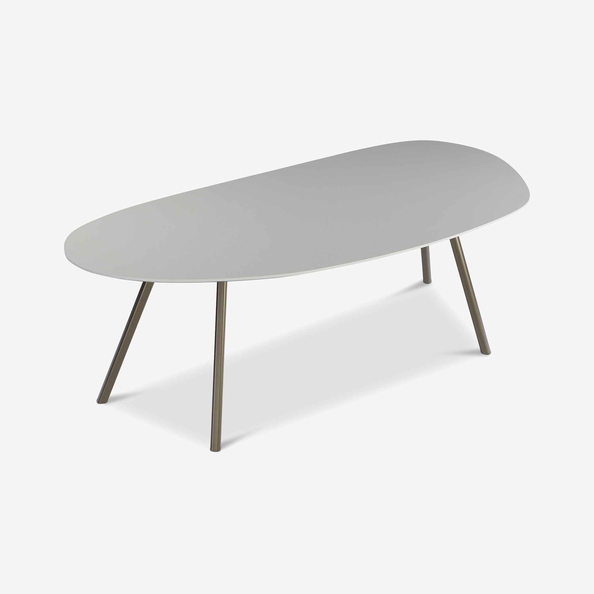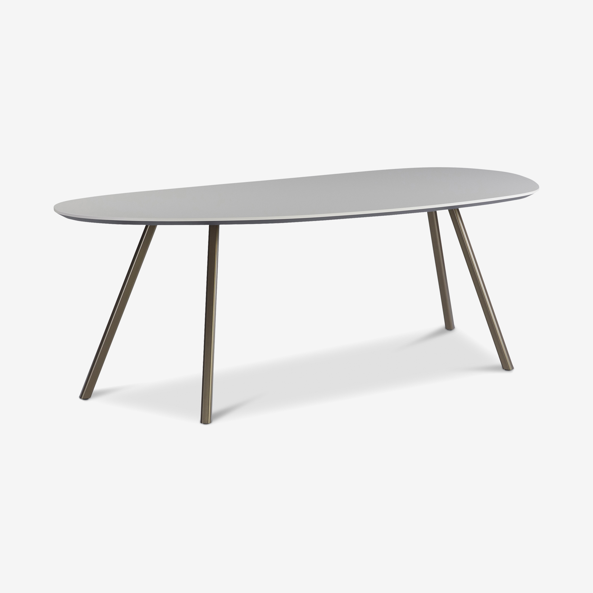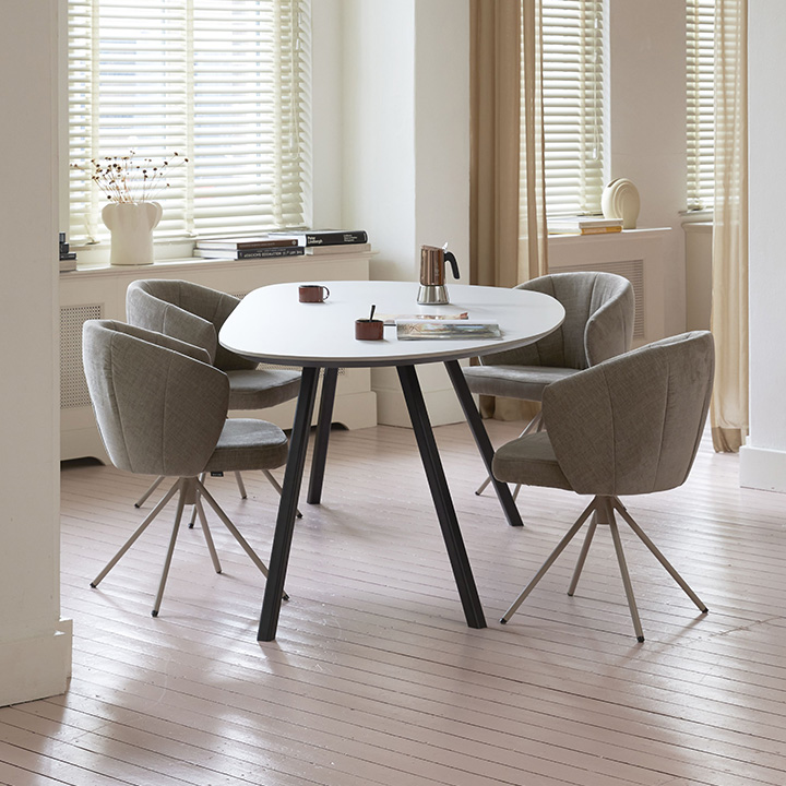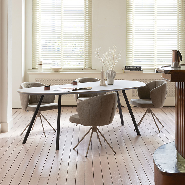 Maak een designstatement met je eettafel. Door Spott vrij in de ruimte te zetten, komt je interieur op een eigenzinnige manier tot leven. Het niervormige HPL Fenix blad en het minimalistisch vormgegeven onderstel maakt Spott een uniek object.