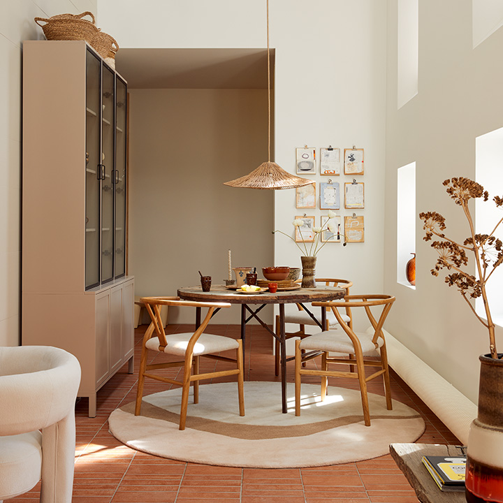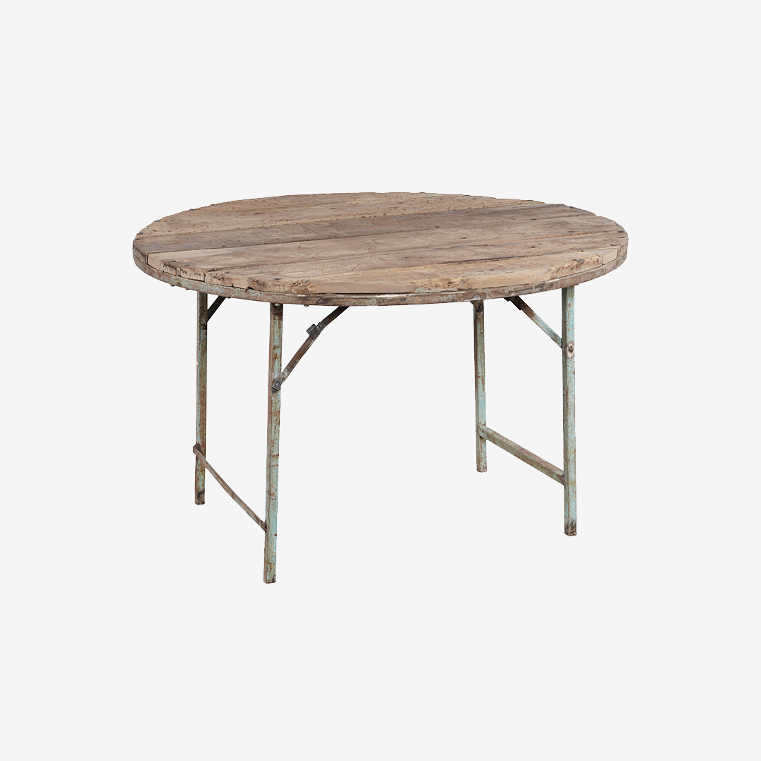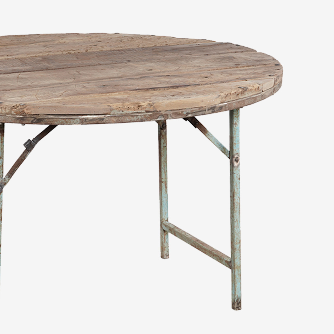 Oude ronde markttafel met grof houten blad op metalen onderstel.