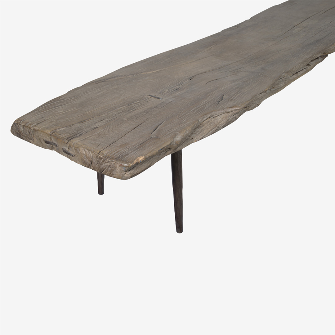 Deze unieke smalle maar lange salontafel met oud en grof Elmhouten blad is ruim 200 cm. lang en geeft je interieur karakter. Staat op stoere taps toelopende metalen pootjes.