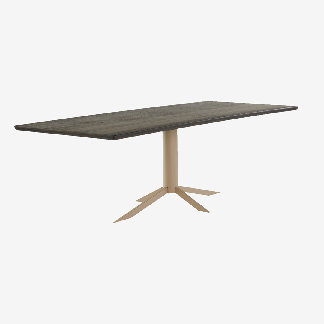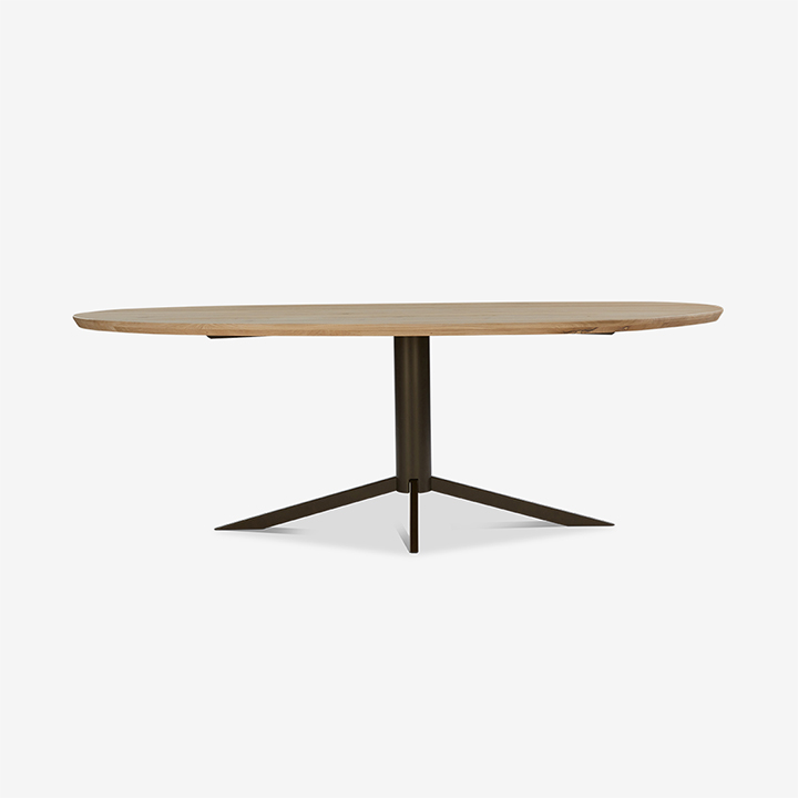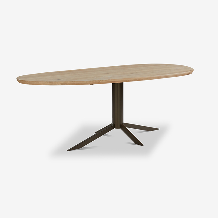 De vierteens poot opnieuw uitgevonden. De kolom lijkt tussen de poten te zweven. De Flint eettafel is samen te stellen met keuze uit diverse bladvormen en materialen in verschillende afmetingen en kleuren.
