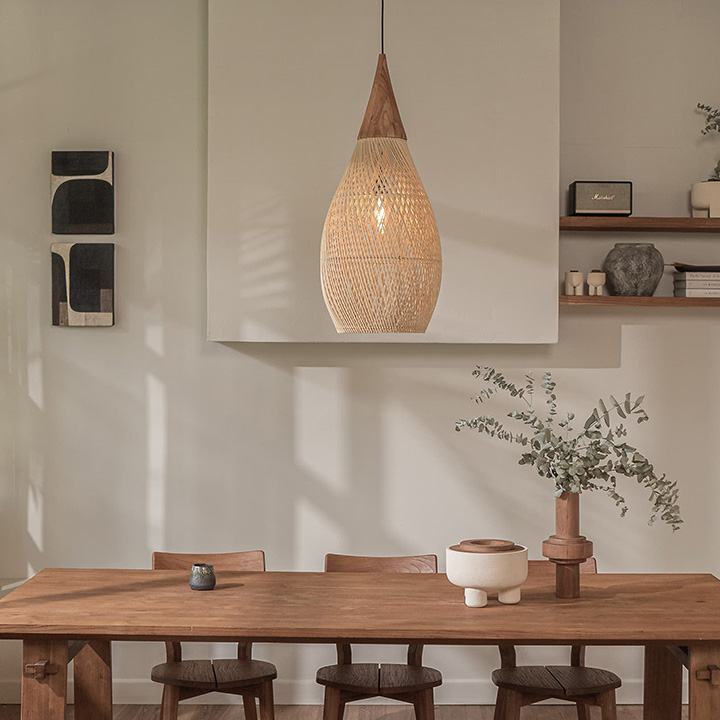 De Horn is een prachtige hanglamp voor kleinere ruimtes maar is ook goed te mixen met andere lampen voor een mooi cluster boven de eettafel. Het organisch gevormde rotan is nauwkeurig met de hand geweven, volgens traditionele Javaanse techniek. Er is keuze uit verschillende maten.