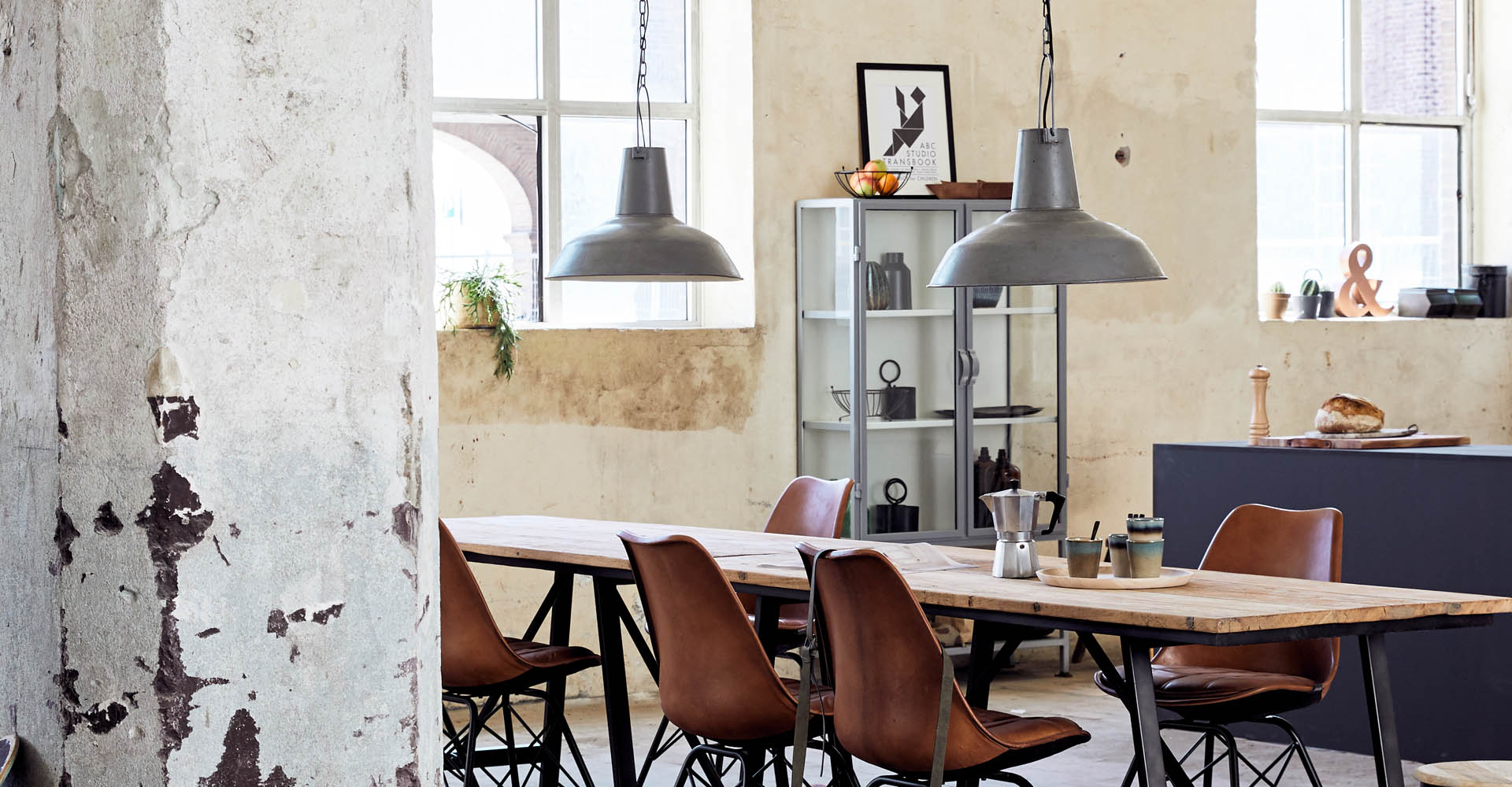 Grof afgewerkte hanglamp met grijs metalen kap aan ketting. Deze lamp past goed in een industriëel of landelijk interieur.