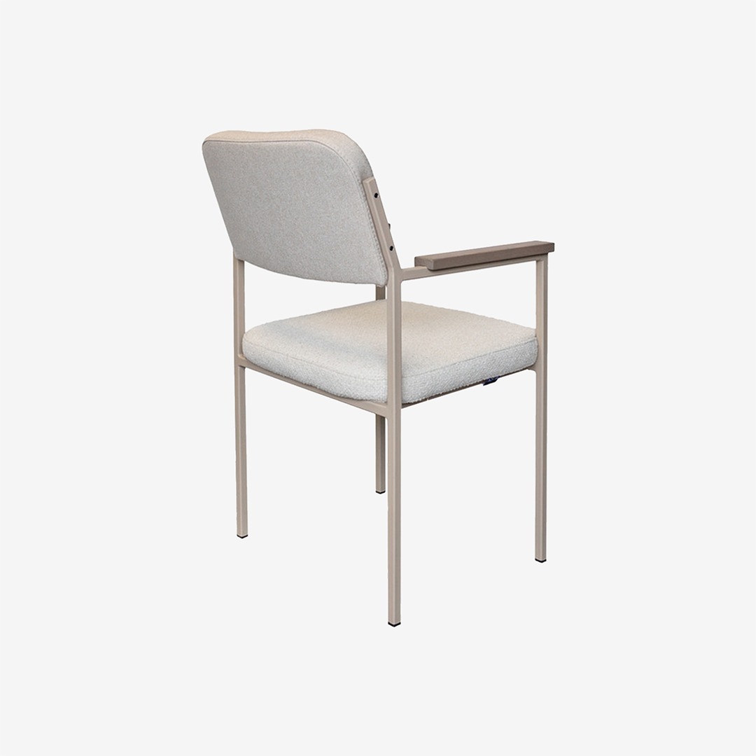 Deze kubistisch vormgegeven eetkamerstoel biedt moderne vormgeving met heerlijk comfort. Stoffering, frame en armleggers zijn in diverse kleuren verkrijgbaar.